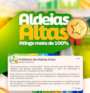 “Esse resultado é fruto do comprometimento e da dedicação de todos que fazem a educação de Aldeias Altas. Nosso objetivo é garantir que cada criança e adolescente tenha o direito de aprender, de sonhar e de construir um futuro melhor. O programa Busca Ativa Escolar é fundamental nesse processo, e alcançar 100% da meta demonstra que estamos no caminho certo, trabalhando com responsabilidade e amor pela nossa gente.”