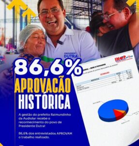 O prefeito Raimundinho da Audiolar, tem centenas de motivos para comemorar os primeiros meses de sua gestão em Presidente Dutra. De acordo com pesquisa realizada pelo Instituto INOP de Pesquisa, sua administração já ultrapassa a marca de 80% de aprovação popular, um índice considerado histórico no município.